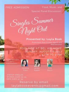 Our biggest Jewish Singles event of the year! Free Admission! Time to relax, have some delicious food, listen to music, hear Jessica Fass of Fass Pass to Love along with Jenny Appelbaum of Jenny Apple Matchmaking, Erin Davis, wingwoman and founder of Shabbatness, and mingle with a great crowd! SPACE IS LIMITED SO RESERVE SOON! Women Ages: 25 to 45 Men Ages: 30 to 55 RESERVE BY EMAIL TO RECEIVE ADDRESS: laylabookevents@gmail.com Reservations must be received by Aug 3 at 5 pm