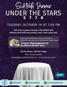 "A Funny Thing Happened on the Way to the New Year..." Featuring Comedian Erin Davis and words of inspiration from Rabbis Elie Weinstock and Daniel Kraus Join us for an amazing night under the Sukkah with delicious food, wine pairings, music, and good people! $45/person ckj.rg/kjbsukkah