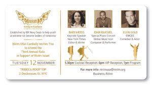 Please join me at this very special event to support Nirim Israel, an incredible organization that guides extreme-risk youth in Israel to acquire the tools, values and confidence to overcome harsh circumstances and rewrite their life stories. Nirim's 3rd Annual Gala is going to be an incredible experience: the emcee is one of my favorite comedians, Elon Gold! Bari Weiss will be giving the keynote, and talented pianist Idan Raichel will perform! I'll be there and hope to see you!