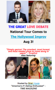 Nick Viall from ABC's "The Bachelor" and Academy Award Winner Tatum O'Neal headline The Great Love Debate with Brian Howie national tour's returns to Los Angeles at the World-Famous Hollywood Improv Comedy Club! And featuring an on-stage lineup of Hollywood's most prominent voices, specialists, & personalities - including: Krista Allen Erin Davis Christina Weber James Michael Sama & more! ************************* THIS EVENT WILL SELL OUT QUICKLY, get your tickets now:http://hollywood.improv.com/comedian/tw-eventinfo/The+Great+Love+Debate+with+Brian+Howie/7543345/ Tickets limited to 100 per gender ****************** Doors open at 7:00pm for cocktails & mingling, showtime is 8pm FOR ALL ATTENDEES,THE FUN CONTINUES IMMEDIATELY FOLLOWING THE EVENT WITH OUR POST-SHOW MIXER and MEET & GREET! This show will be recorded as a live audience podcast for The Great Love Debate Podcast, the World's #1 Dating & Relationship Podcast! FOR MORE NORTH AMERICAN TOUR DATES OR FURTHER INFO VISITwww.GreatLoveDebate.com Hosted by Brian Howie (who Time Magazine declared "America's #1 Dating Enthusiast"), the panel […]